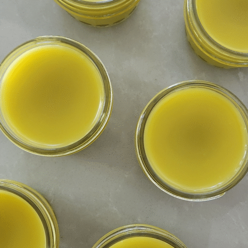 Freshly poured calendula salve cooling in glass jars — golden, soothing, and perfect for dry skin care.