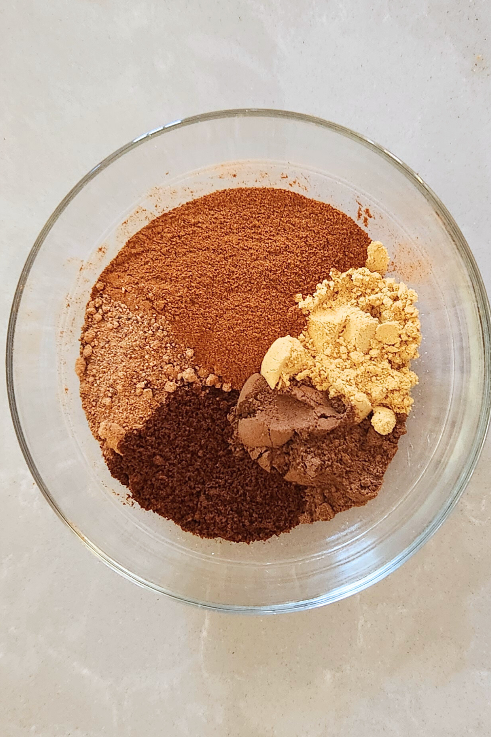 Dump all the spices into a bowl. No need for fancy steps—just pour and stir.