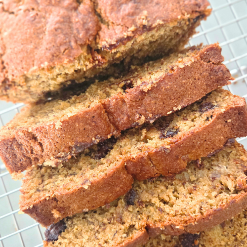 - Pour into prepared loaf pan and bake 55–65 minutes, until a toothpick comes out clean.