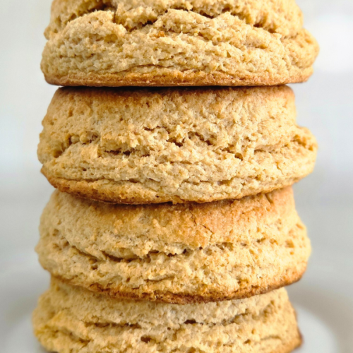 These fluffy, flaky, fresh-milled flour biscuits are tall, tender, and full of the lightly sweet, wheaty flavor you only get from freshly milled grain. Made with soft white wheat and plenty of cold butter, they bake up with soft centers and delicate layers—simple, rustic biscuits that work just as well for breakfast as they do for dinner or sandwiches.