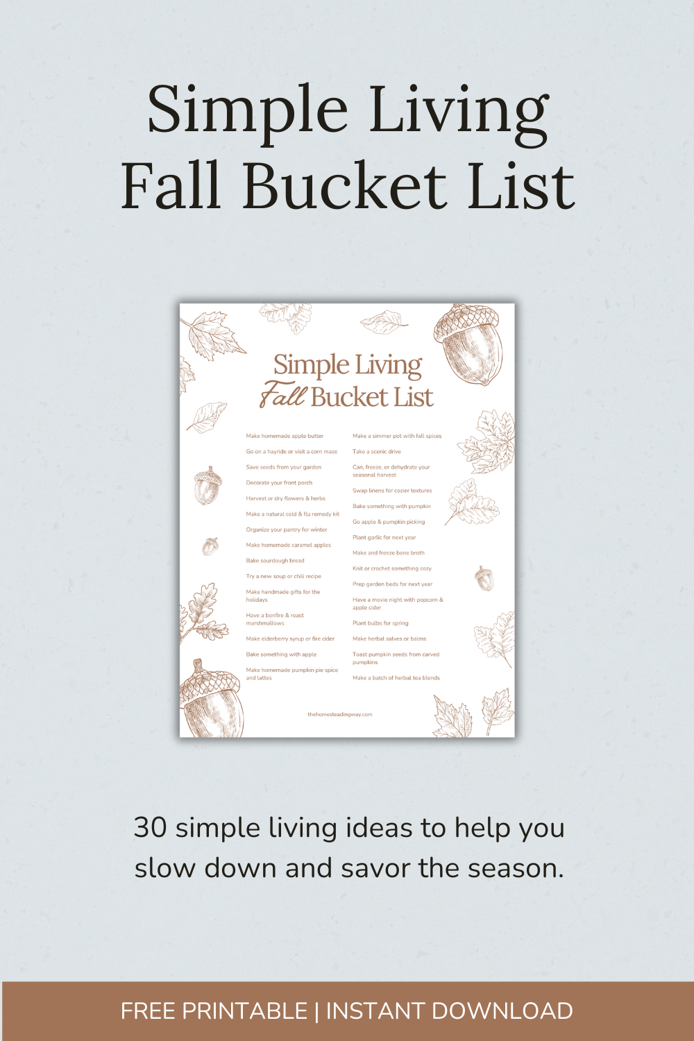Ready to make fall your favorite season? Embrace simple living with this free printable—30 cozy, intentional ideas to help you slow down and savor autumn. Check off everything from saving seeds and drying herbs to making homemade pumpkin pie spice!